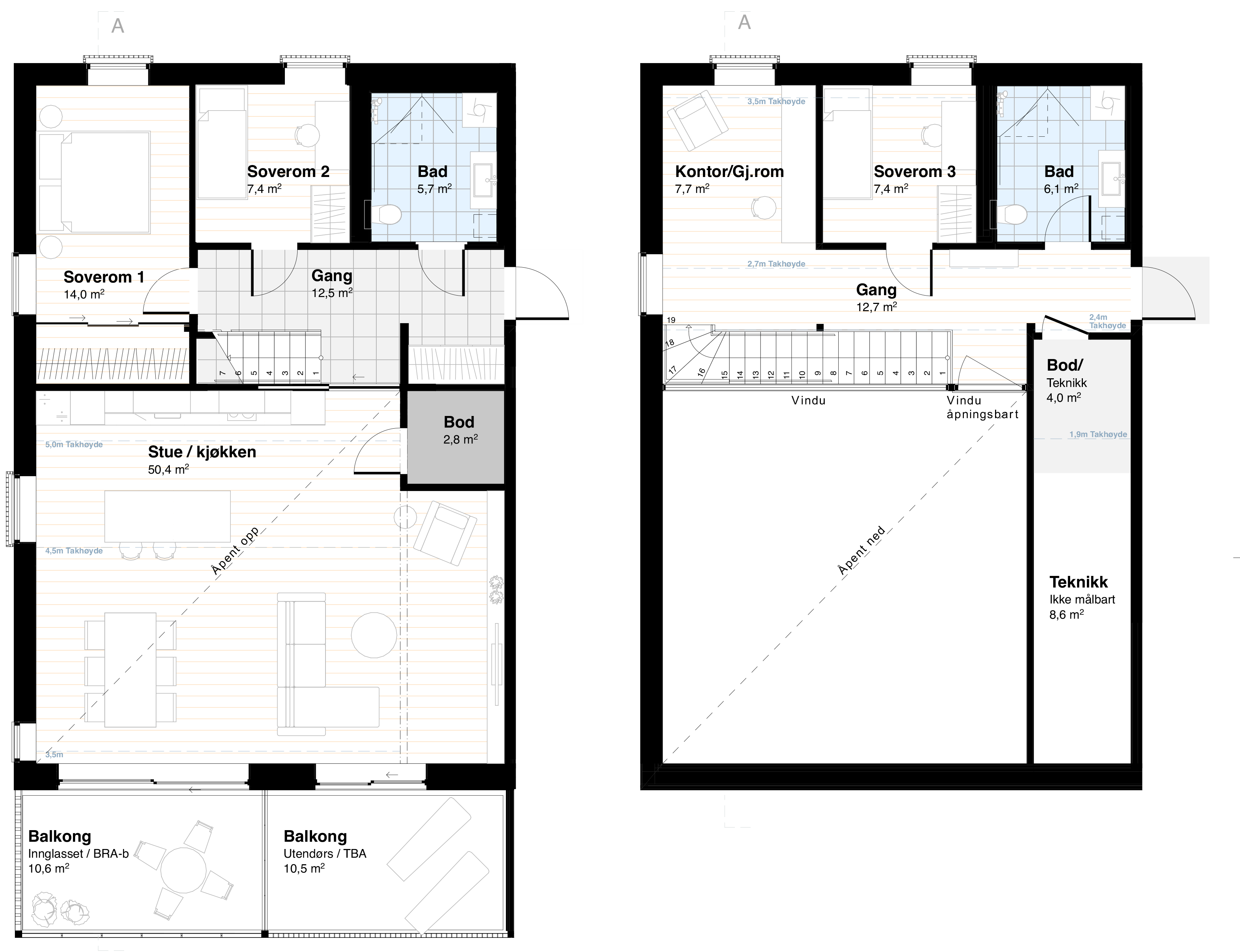 Gjennomgående leilighet. Åpen og innglasset balkong.