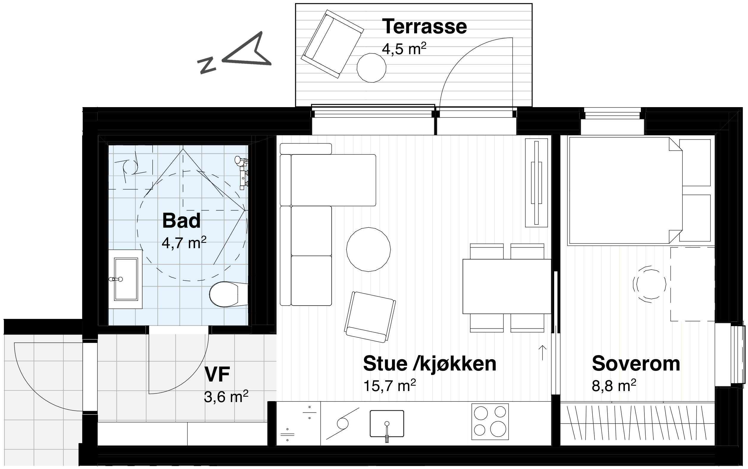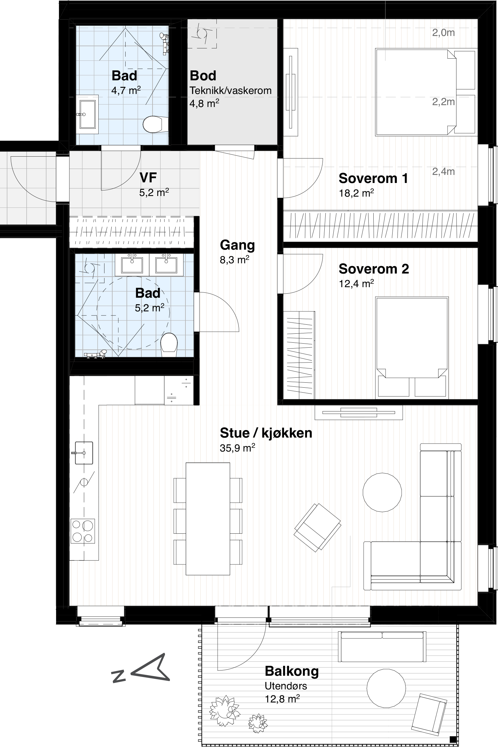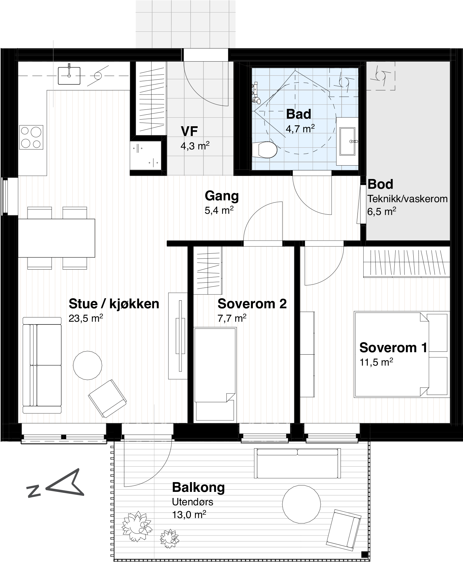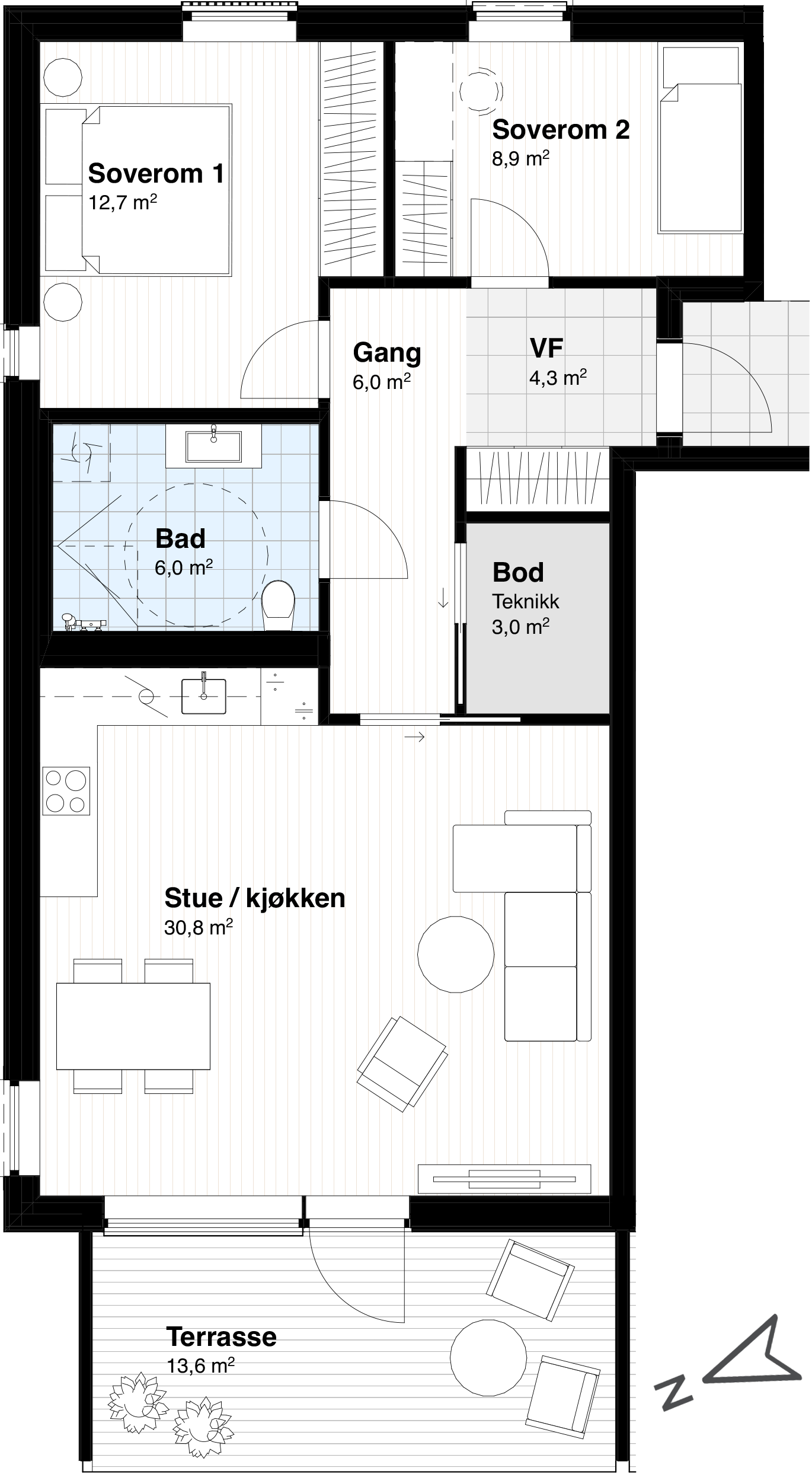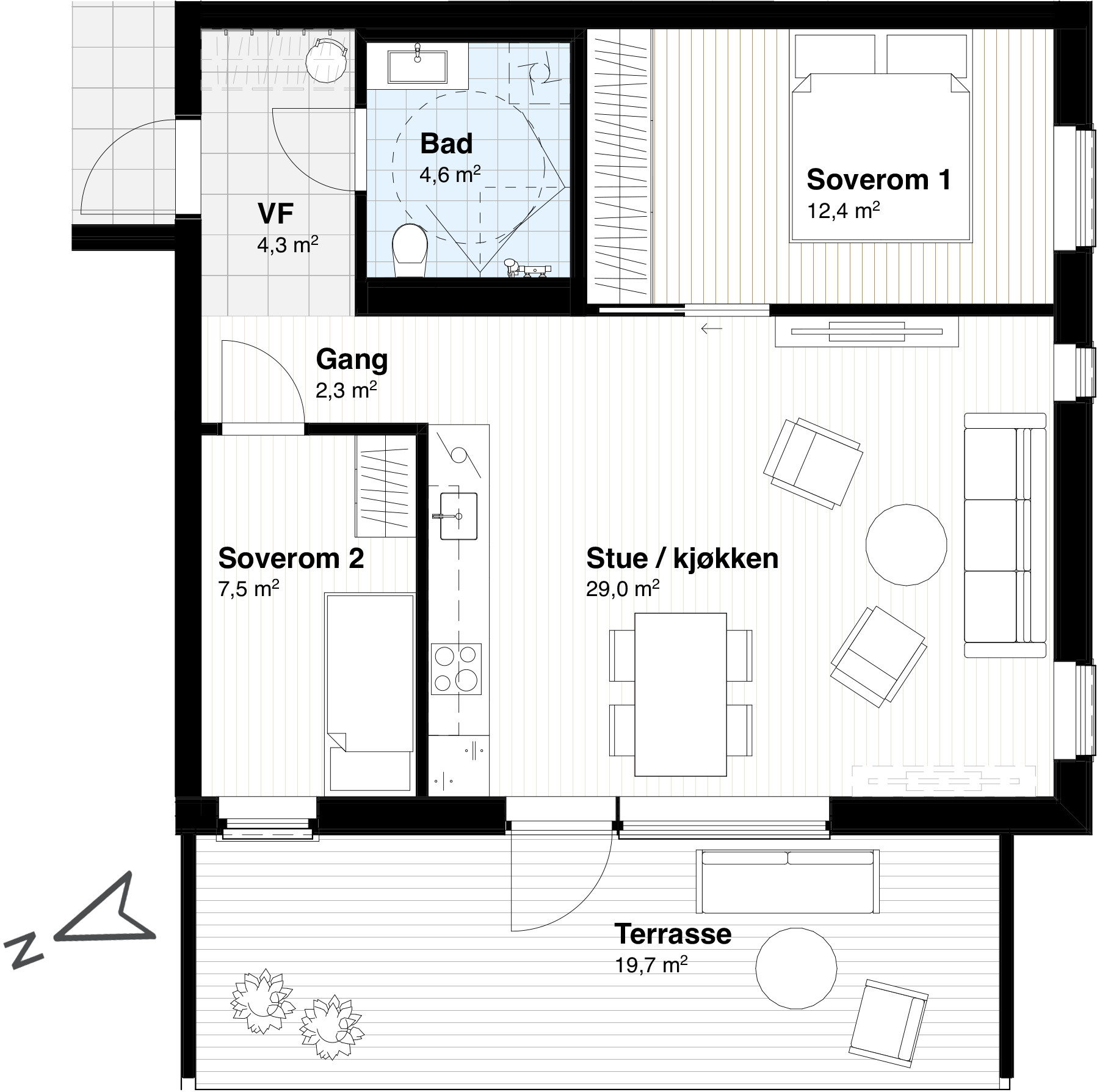 105 Kvm (3 sov & 2 bad)På bakken, men allikevel hevet nesten 2 meter over veinettet, finner vi en familievennlig bolig over 2 plan med 3 soverom og 2 bad. Her bor du med det beste av hva en leilighet kan by på, hvor ungene sover en etasje over deg når du sitter i stuen. Og du har privat uteplass!