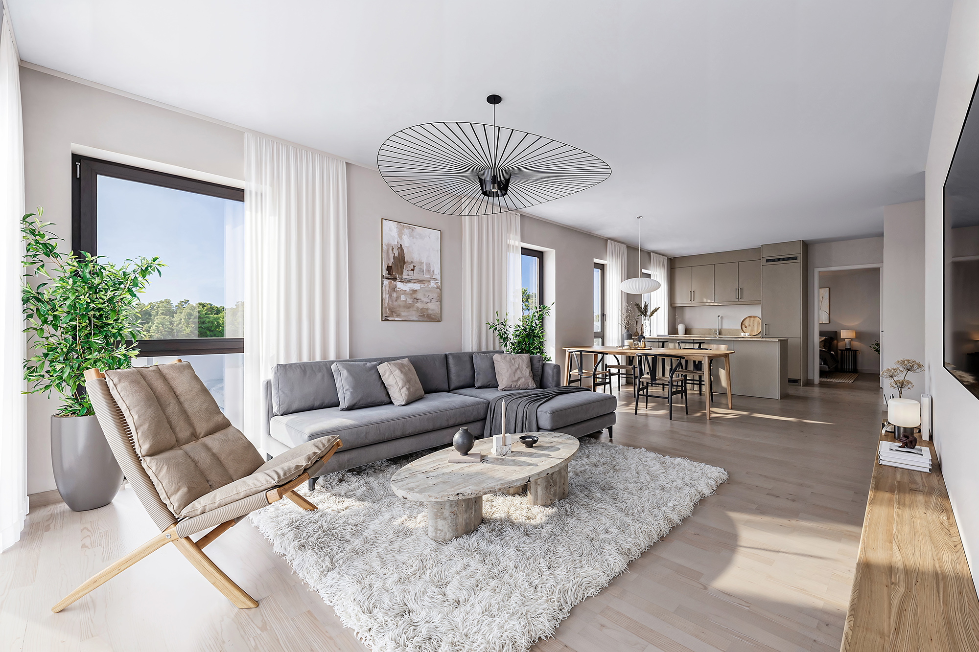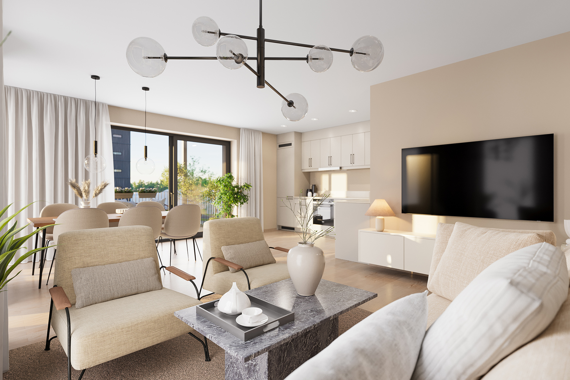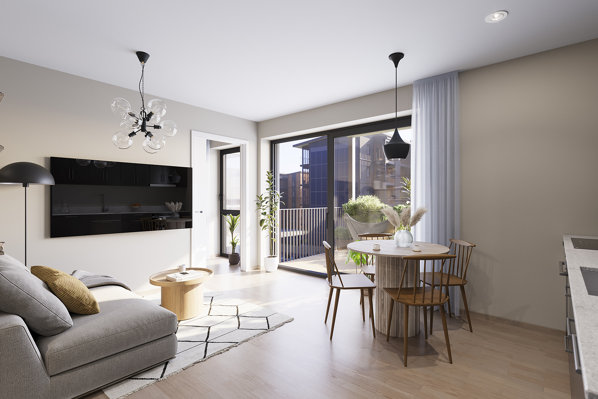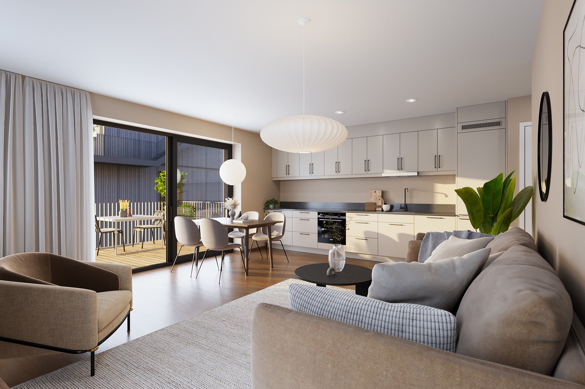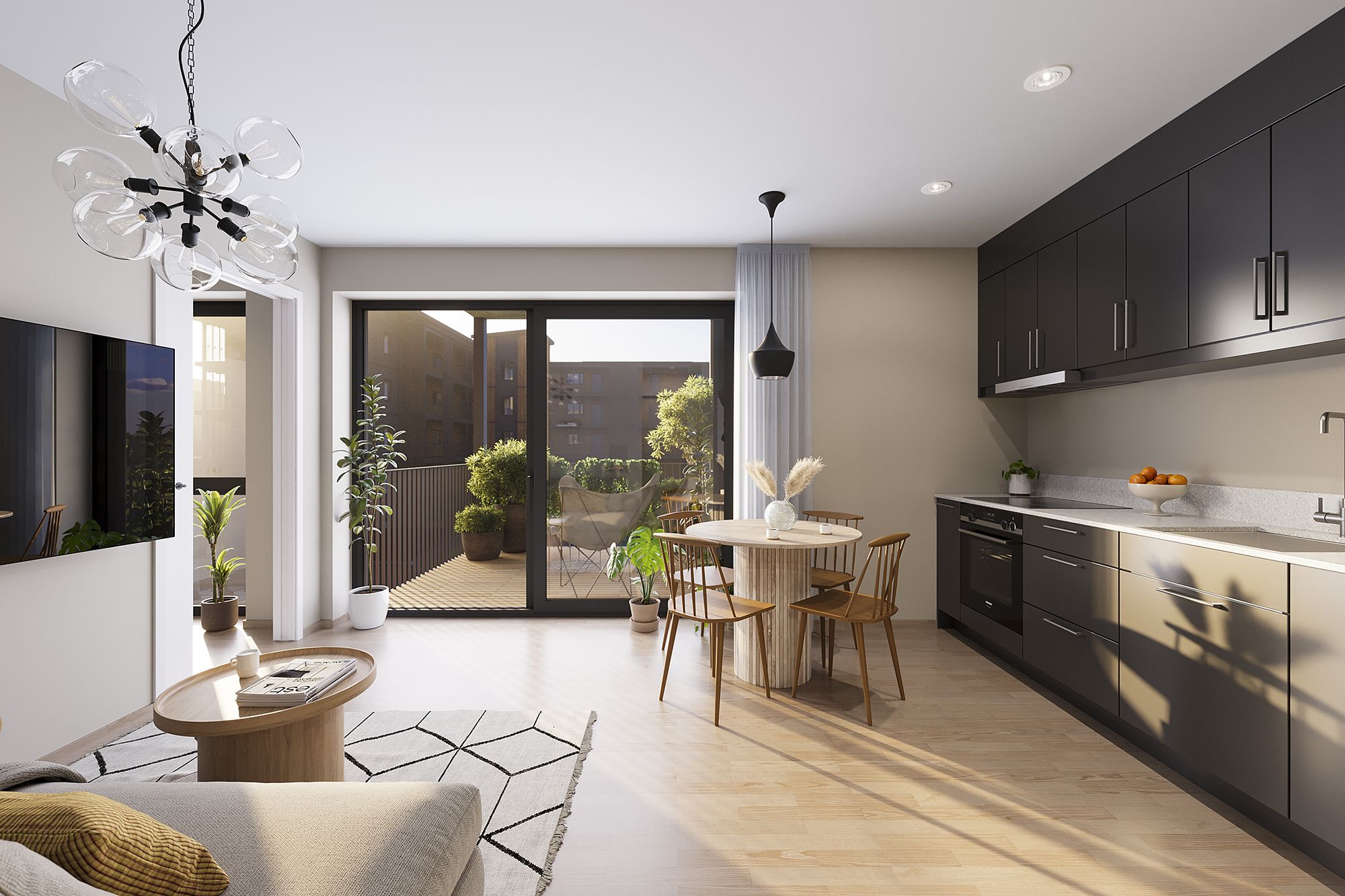 Hagen blir beplantet og parkmessig opparbeidet, med trær, frodige grøntområder og soner for både ro og aktivitet. Her finner du lekeplass for de minste, komfortable sittebenker, solsenger og hyggelige møteplasser som inviterer til både hverdagsliv og lange sommerdager.