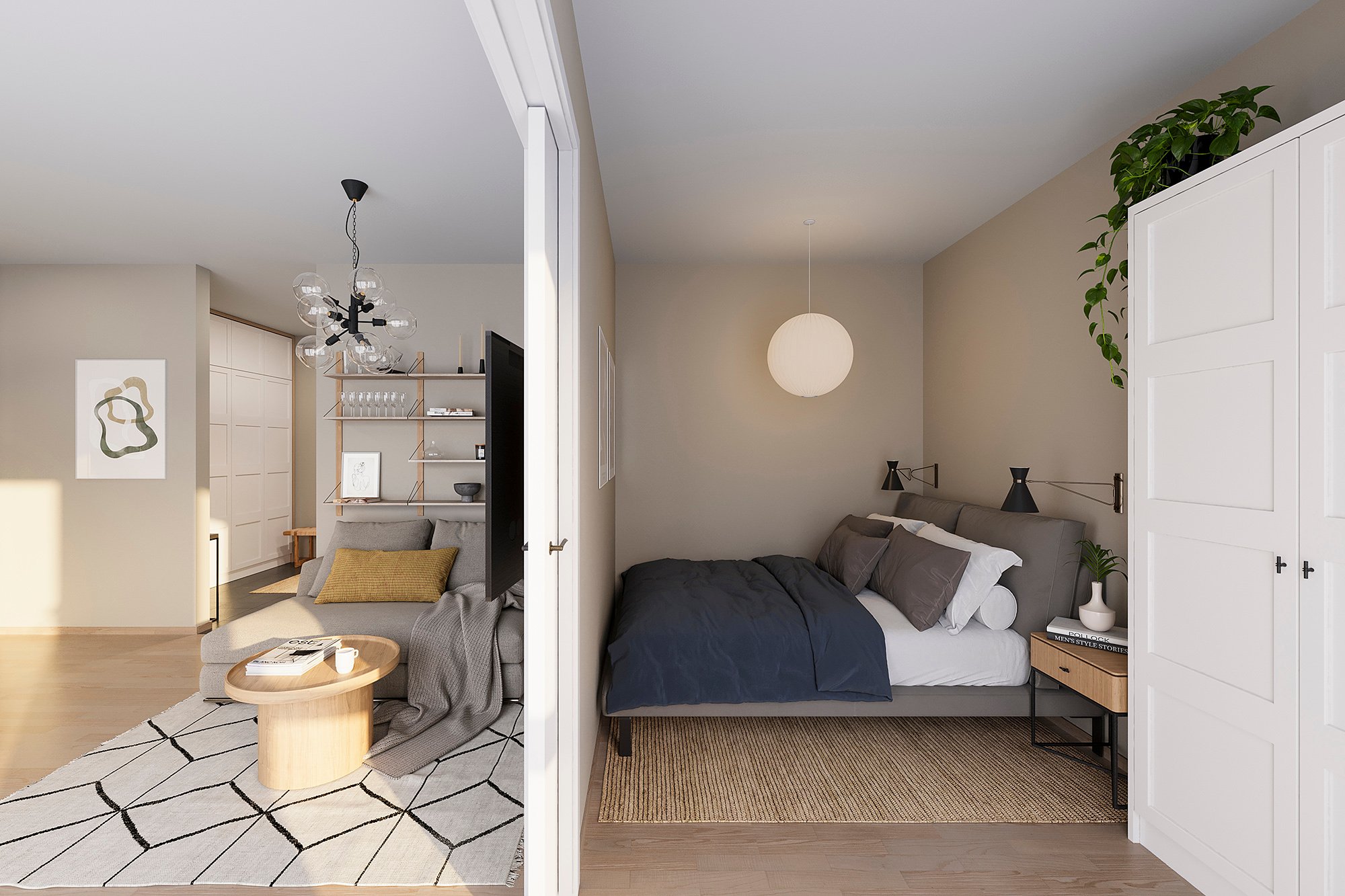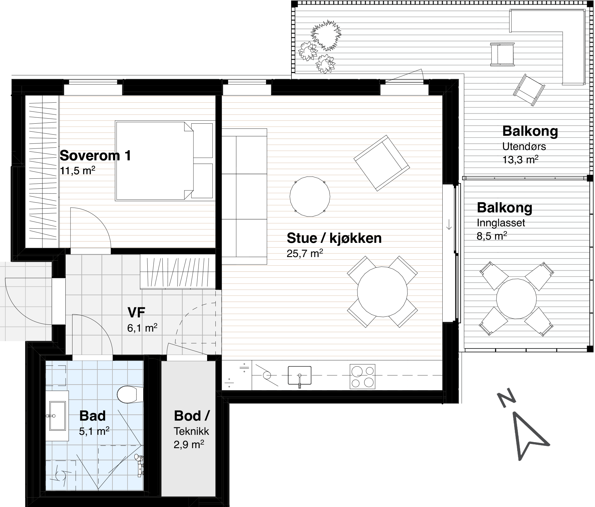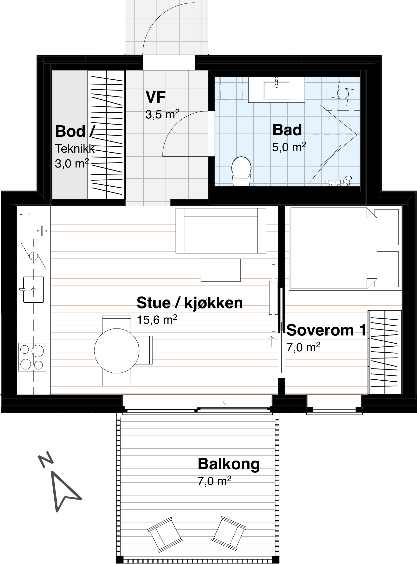 Det er også en variant på 60 kvm med 2 soverom.