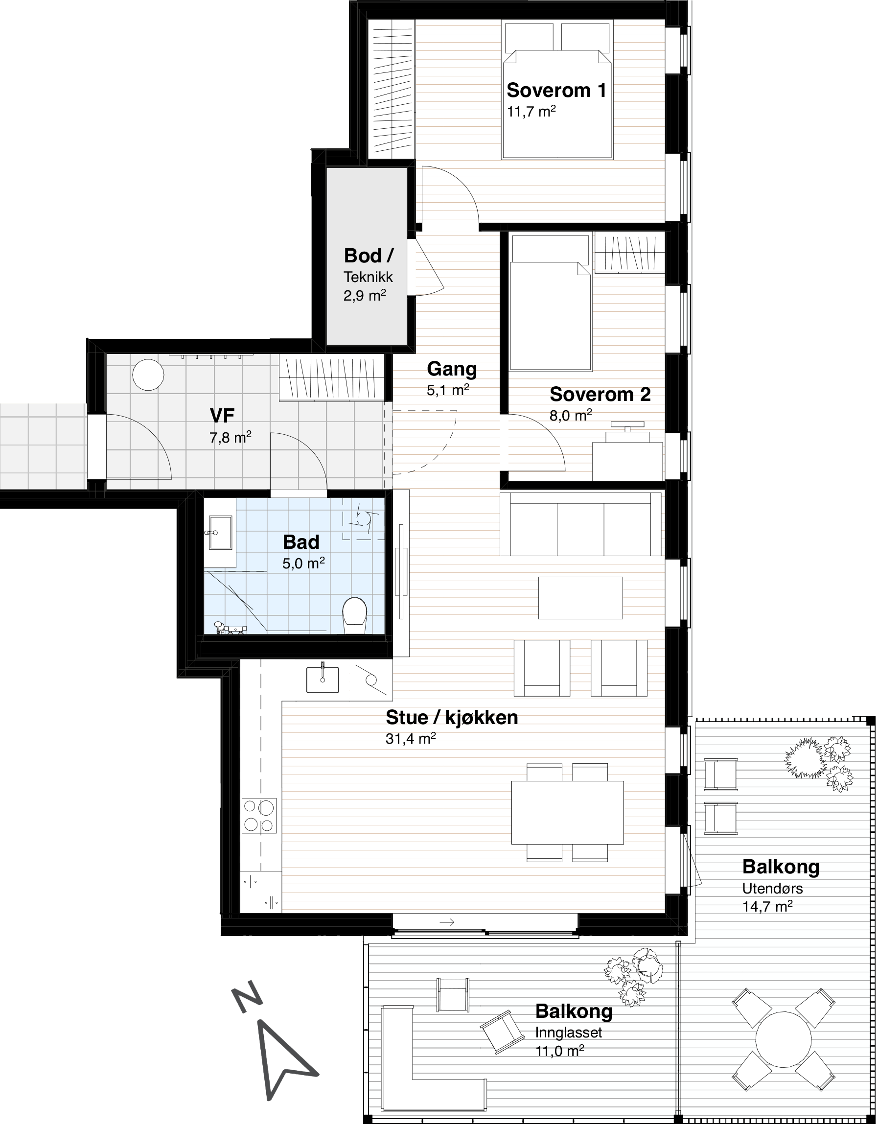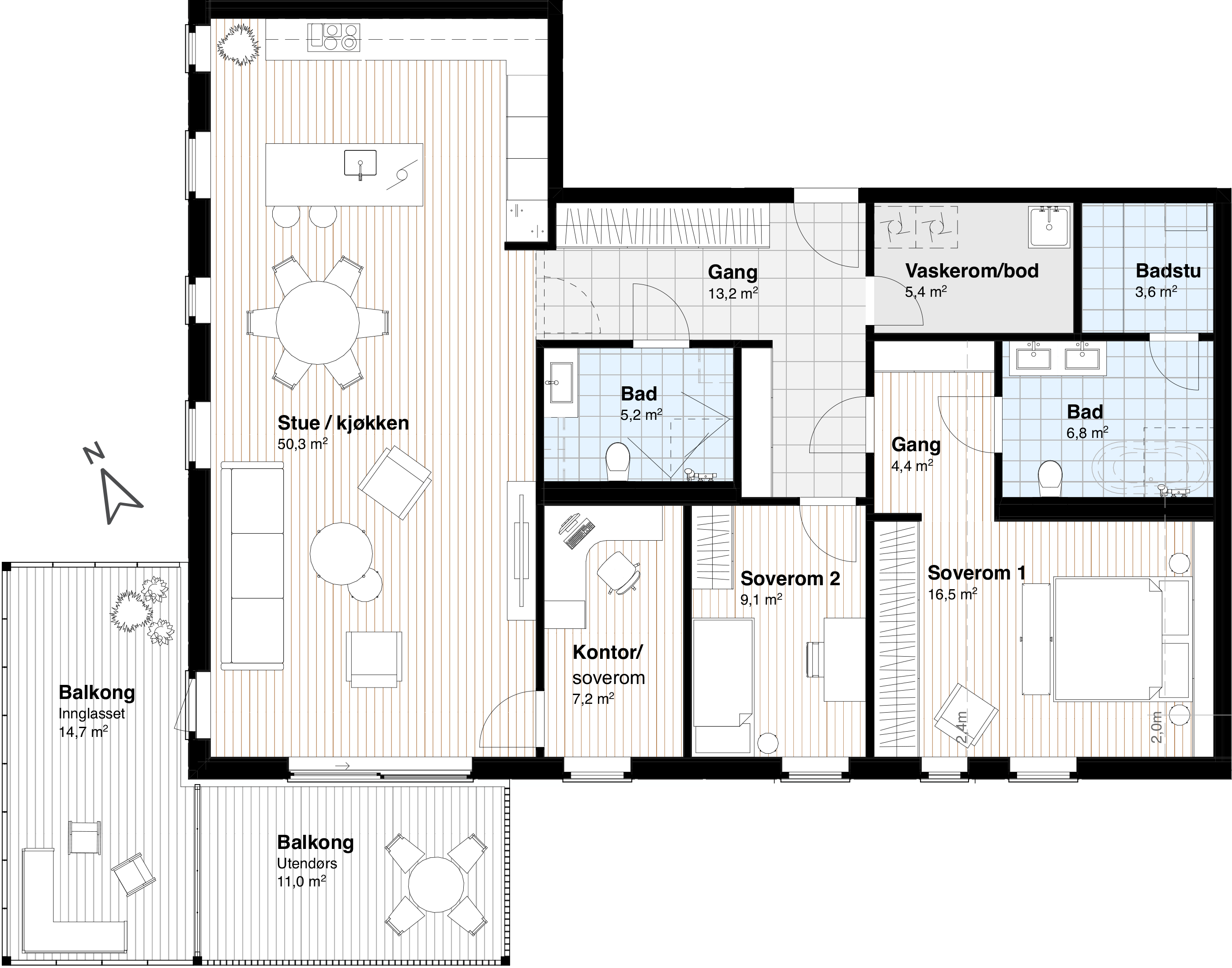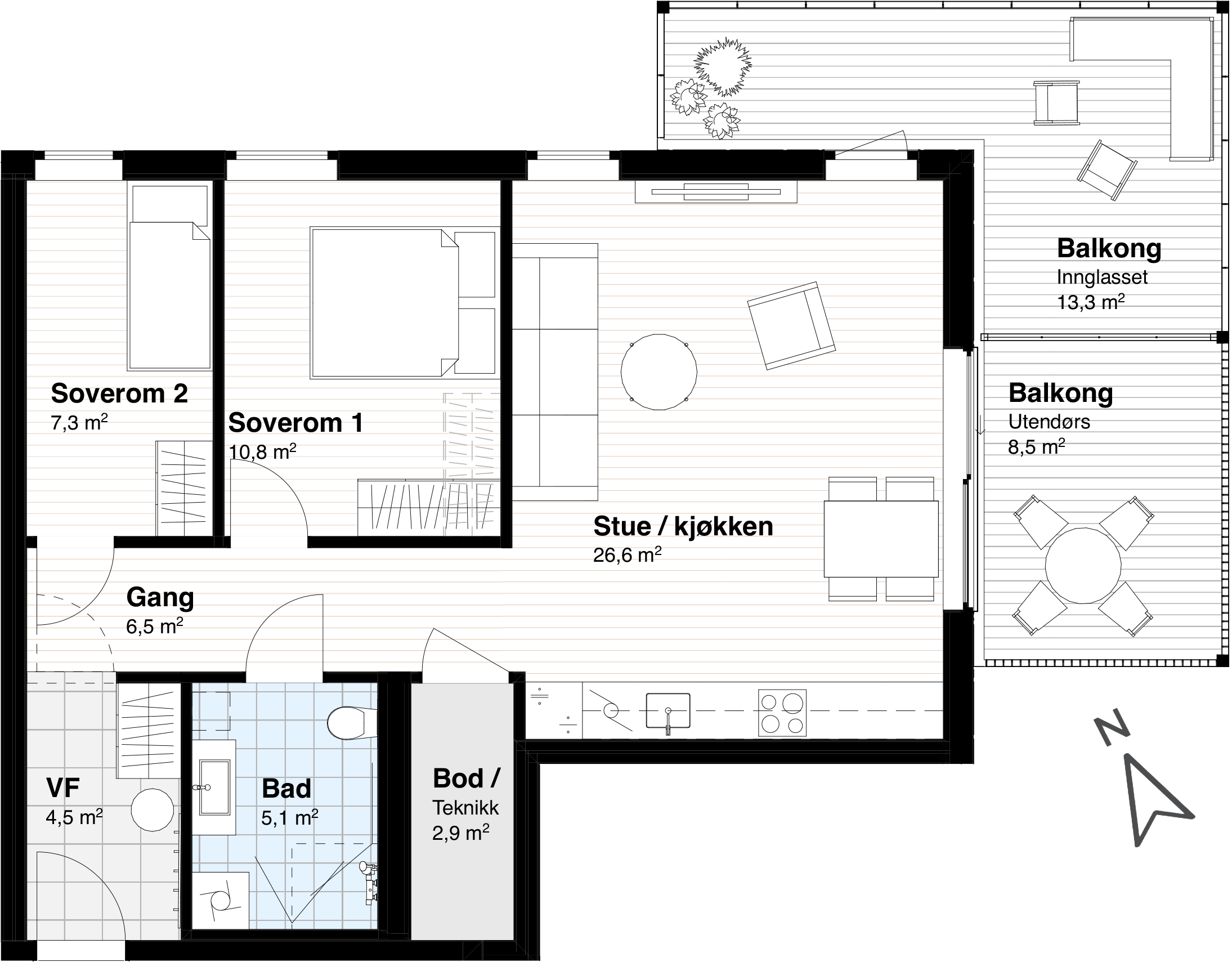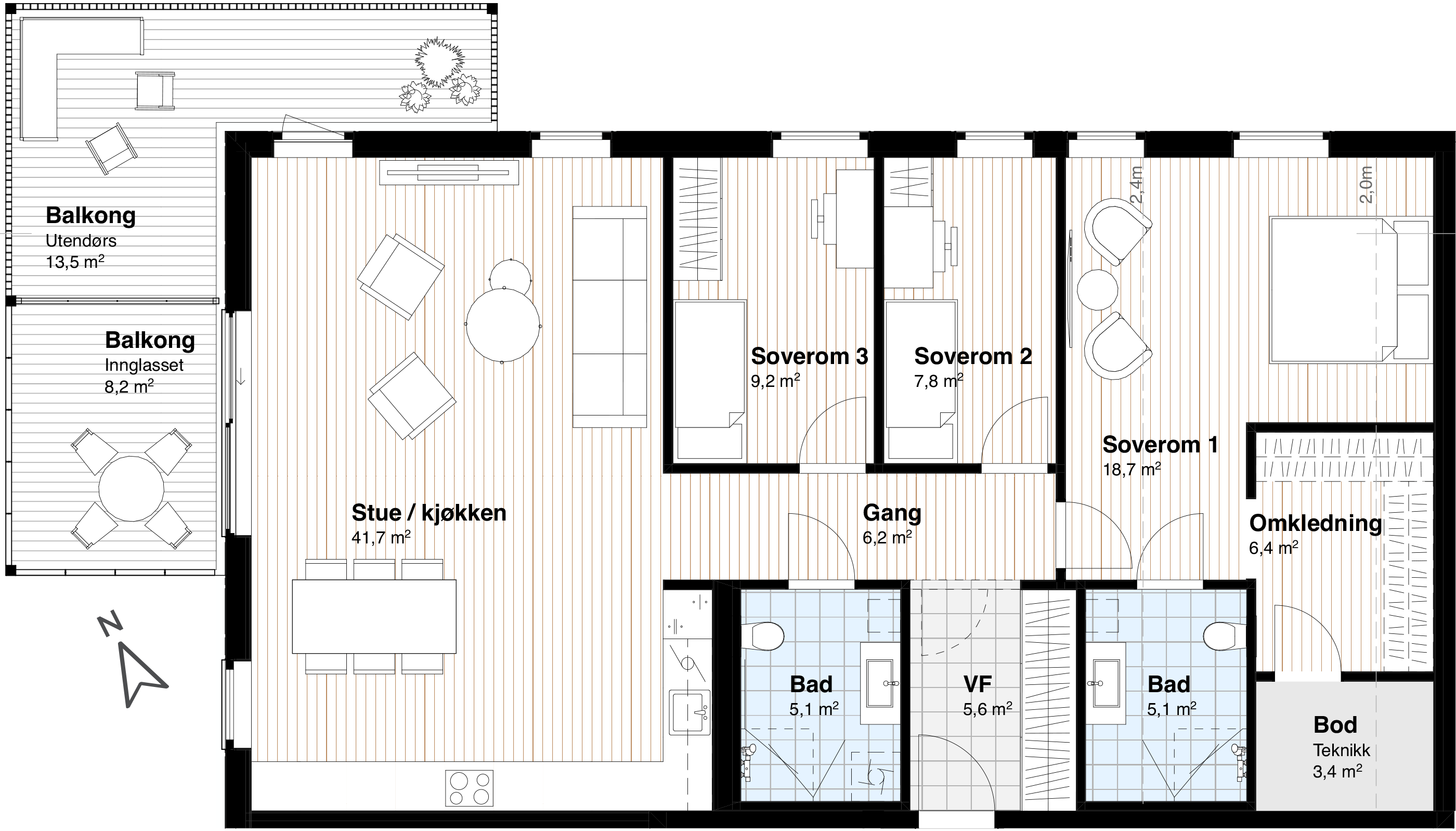 Tre soverom og to bad - E605
