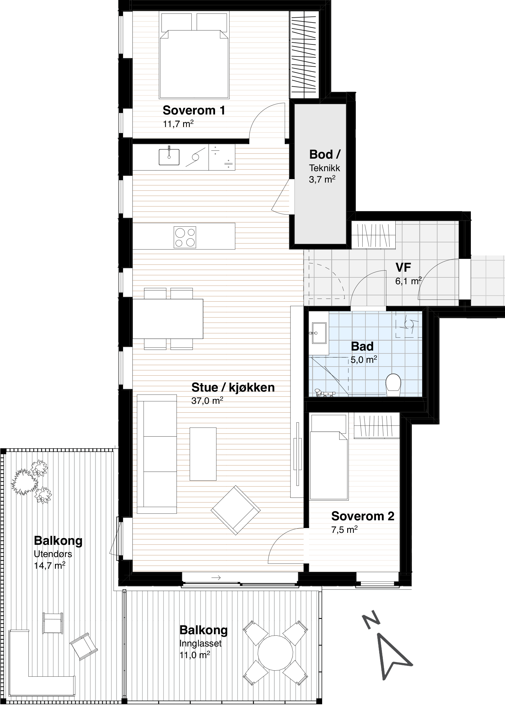 105 Kvm (3 sov & 2 bad)På bakken, men allikevel hevet nesten 2 meter over veinettet, finner vi en familievennlig bolig over 2 plan med 3 soverom og 2 bad. Her bor du med det beste av hva en leilighet kan by på, hvor ungene sover en etasje over deg når du sitter i stuen. Og du har privat uteplass!